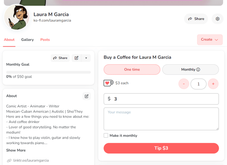 What is Ko-Fi? It is a website where you can support your favorite creators and their work! You can donate any amount you wish, whether it’s a one-time or monthly donation!